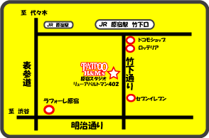 竹下通りのほぼ真ん中あたりです。原宿駅の竹下口から入ってくれば、右側。